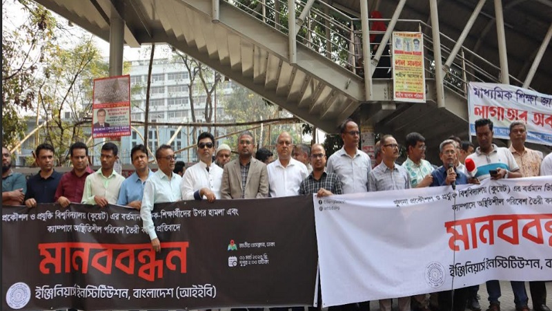 ইঞ্জিনিয়ার্স ইনস্টিটিউশন বাংলাদেশ (আইইবি) এর উদ্যোগে খুলনা প্রকৌশল ও প্রযুক্তি বিশ্ববিদ্যালয় (কুয়েট) এর উপাচার্য ও শিক্ষকদের উপর নির্মম হামলা ও ক্যাম্পাসে অস্থিতিশীল পরিবেশ সৃষ্টির প্রতিবাদে শনিবার জাতীয় প্রেসক্লাবের সামনে দুপুর ২ টায় মানববন্ধন অনুষ্ঠিত হয়।
