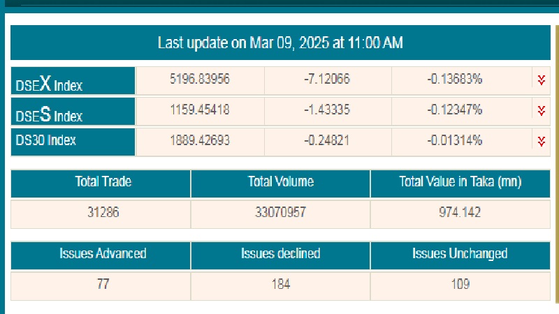 দেশের প্রধান পুঁজিবাজার ঢাকা স্টক এক্সচেঞ্জে (ডিএসই) সপ্তাহের প্রথম কার্যদিবস রবিবার (৯ মার্চ) মূল্যসূচকের পতনের মধ্য দিয়ে চলছে লেনদেন। কমছে বেশির ভাগ কোম্পানির শেয়ারদর।
