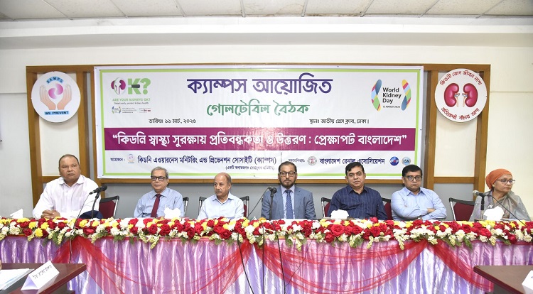 ‘‘বিশ্ব কিডনি দিবস-২০২৫’’ উদযাপন উপলক্ষ্যে আয়োজিত কর্মসূচীর অংশ হিসেবে দেশের শীর্ষস্থানীয় কিডনি বিষয়ক বেসরকারী স্বেচ্ছাসেবী সংস্থা কিডনি এওয়ারনেস মনিটরিং এন্ড প্রিভেনশন সোসাইটি (ক্যাম্পস), ১১ মার্চ (মঙ্গলবার) জাতীয় প্রেস ক্লাবের তফাজ্জল হোসেন মানিক মিয়া হলে এই গোলটেবিল বৈঠকের আয়োজন করে। সহযোগী সংগঠন হিসেবে ছিলো বাংলাদেশ রেনাল এসোসিয়েশন।