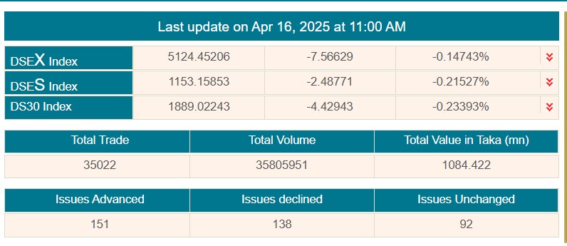 দেশের প্রধান পুঁজিবাজার ঢাকা স্টক এক্সচেঞ্জে (ডিএসই) সপ্তাহের তৃতীয় কার্যদিবস বুধবার (১৬ এপ্রিল) মূল্যসূচকের পতনের মধ্য দিয়ে লেনদেন চলছে। তবে বেড়েছে বেশির ভাগ কোম্পানির শেয়ারদর।