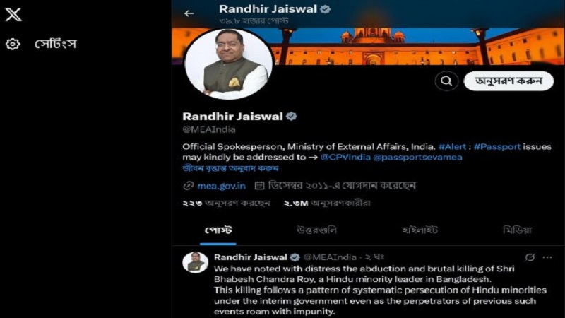 বাংলাদেশের হিন্দু নেতা ভবেশ চন্দ্র রায়কে অপহরণ ও নৃশংসভাবে হত্যার তীব্র নিন্দা জানিয়েছেন ভারতের পররাষ্ট্র মন্ত্রণালয়ের মুখপাত্র রণধীর জয়সওয়াল।