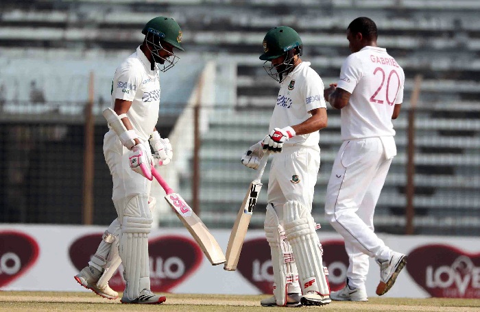 এরপরের ওভারেই ফিরে যান হাসান। ওয়েলিংটন মাসাকাদজার অফ স্টাম্প তাক করা বলে সজোরে হাঁকাতে গিয়ে মিড অফে ক্যাচ দিয়ে ফিরে যান হাসান। উইকেটে এসে পরের বলেই ফিরে যান খালেদ আহমেদ। মাসাকাদজার ফুল লেংথ ডেলিভারিতে প্রথম স্লিপে ক্যাচ দেন গোল্ডেন ডাক মারা খালেদ। ৭৮.১ ওভারে ২৫০ রান পার করে বাংলাদেশ। শেষ উইকেট হিসেবে বিদায় নেয়া জাকের করেন ১১১ বলে ৫৮ রান। মুজারাবানিকে কাউ কর্নারে উড়িয়ে মারতে গিয়ে ক্যাচ আউট হন তিনি।