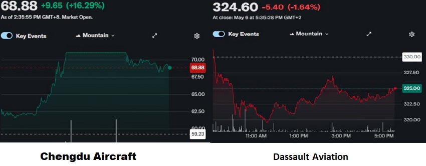 ভারত-পাকিস্তান সংঘাতের নাটকীয় প্রভাব পড়েছে যুদ্ধবিমান প্রস্তুতকারী দুই্ কোম্পানি চীনের চেংডু এয়ারক্রাফট করপোরেশন এবং ফ্রান্সের ডেসল্ট এভিয়েশন কোম্পানির শেয়ারে। মঙ্গলবার রাতের ঘটনাবলীর পর আকাশে উড়ছে চেংডুর শেয়ার। অন্যদিকে বড় গোত্তা খেয়েছে ডেসল্ট।