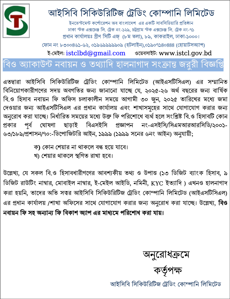 আইসিবি সিকিউরিটিজ ট্রেডিং কোম্পানি লিমিটেড এর বিও একাউন্ট নবায়ন (২০২৫-২৬) সংক্রান্ত জরুরী বিজ্ঞপ্তি প্রকাশ 2025-06-02 18:51:01 Tweet