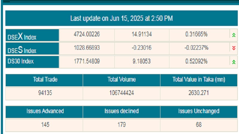 সূত্র মতে, এদিন ডিএসইর লেনদেন শেষে প্রধান সূচক ‘ডিএসইএক্স’ ১৪ দশমিক ৯১ পয়েন্ট বেড়ে অবস্থান করছে ৪ হাজার ৭২৪ পয়েন্টে।