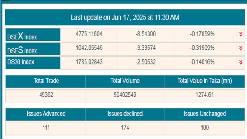 সূত্র মতে, আজ ডিএসইর লেনদেন শুরুর দেড় ঘণ্টায় অর্থাৎ বেলা ১১ টা ৩০ মিনিট পর্যন্ত ডিএসইর প্রধান সূচক বা ‘ডিএসইএক্স’ ৮ দশমিক ৫৪ পয়েন্ট কমে অবস্থান করছে ৪ হাজার ৭৭৫ পয়েন্টে।
