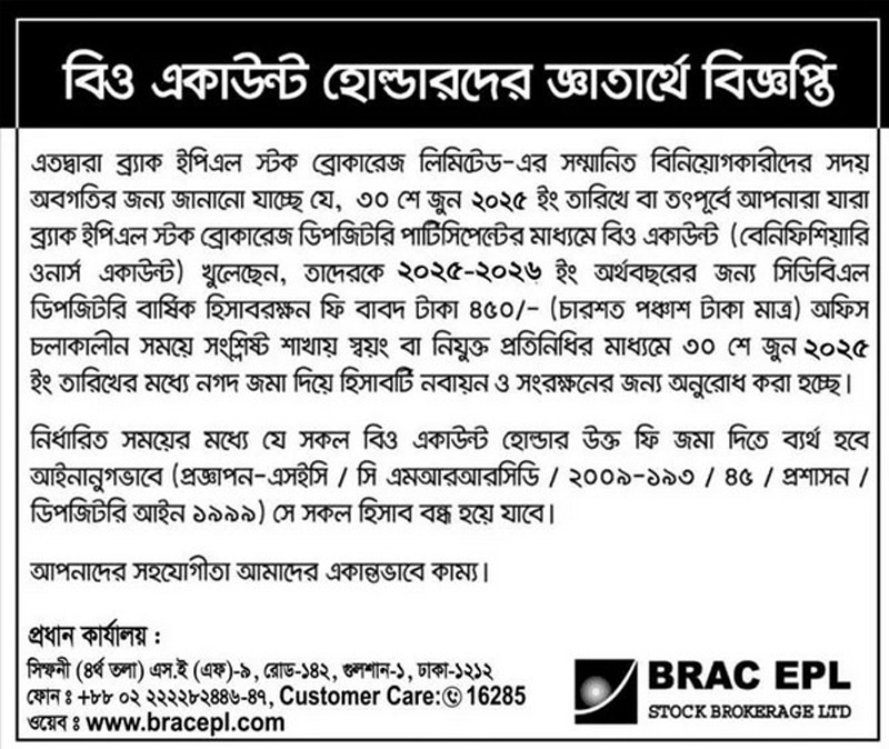 ব্র্যাক ইপিএল স্টক ব্রোকারেজ লিমিটেড এর বিও হিসাব নবায়ন (২০২৫-২৬) সংক্রান্ত বিজ্ঞপ্তি প্রকাশ 2025-06-18 14:19:44 Tweet