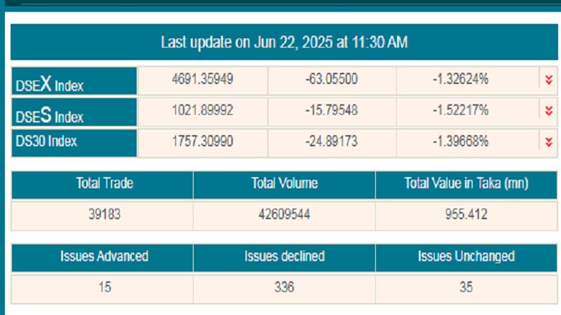 সূত্র মতে, আজ ডিএসইর লেনদেন শুরুর দেড় ঘণ্টায় অর্থাৎ বেলা সাড়ে ১১ টা পর্যন্ত ডিএসইর প্রধান সূচক বা ‘ডিএসইএক্স’ ৬৩ দশমিক ০৫ পয়েন্ট কমে অবস্থান করছে ৪ হাজার ৬৯১ পয়েন্টে।