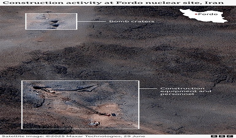 স্যাটেলাইট ছবিতে দেখা গেছে ফোর্দোর পারমাণবিক স্থাপনায় ভারী নির্মাণ সামগ্রী দিয়ে কাজ চলছে। এই পারমাণবিক স্থাপনায় সম্প্রতি বোমা হামলা চালায় যুক্তরাষ্ট্র।