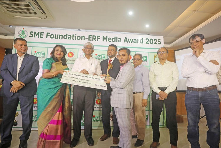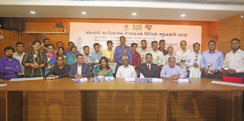 প্রথমবারের মতো এসএমই ফাউন্ডেশন-ইআরএফ মিডিয়া অ্যাওয়ার্ড ২০২৫ পুরস্কার পেয়েছেন দেশের পত্রিকা, টেলিভিশন ও অনলাইন পত্রিকার ২১জন অর্থনৈতিক প্রতিবেদক। পুরস্কারপ্রাপ্তরা হলেন, যমুনা টেলিভিশনের রিমন রহমান, বাংলাদেশ টেলিভিশনের দিনার সুলতানা, চ্যানেল ২৪-এর রাকিব হোসেন ও বাংলাভিশনের গোলাম ময়নুল হোসেন। অনলাইন পত্রিকার প্রতিবেদক, বিডিনিউজ ২৪-এর জেসমিন আরা মলি, জাগোনিউজ ২৪-এর ডিএম নাজমুল হোসেন ও ঢাকা পোস্ট-এর মো. শফিকুল ইসলাম। পত্রিকার পুরস্কারপ্রাপ্ত প্রতিবেদকরা হলেন, ফাইনান্সিয়াল এক্সপ্রেস-এর মোহাম্মদ সাইফুল ইসলাম, রেজাউল করিম, এফএইচএম হুমায়ুন কবির, জাহিদুল ইসলাম ও ফারহান ফেরদৌস, সমকালের জসিম উদ্দিন বাদল, ডেইলি সান-এর মৌসুমী ইসলাম ও রফিকুল ইসলাম, আমাদের সময়ের জিয়াদুল ইসলাম, বাণিজ্য প্রতিদিনের গিয়াস উদ্দিন, আজকের পত্রিকার শাহ আলম খান, আজকের দৈনিকের মরিয়ম মনি এবং রূপালী বাংলাদেশের মো. হাসান আরিফ ও রহিম শেখ।