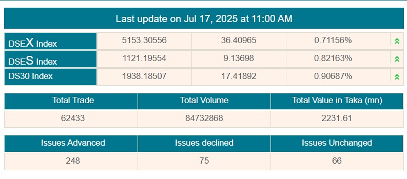 দেশের প্রধান পুঁজিবাজার ঢাকা স্টক এক্সচেঞ্জে (ডিএসই) সপ্তাহের শেষ কার্যদিবস বৃহস্পতিবার (১৭ জুলাই) মূল্যসূচকের উত্থানের মধ্য দিয়ে চলছে লেনদেন। বেড়েছে বেশির ভাগ কোম্পানির শেয়ারদর।