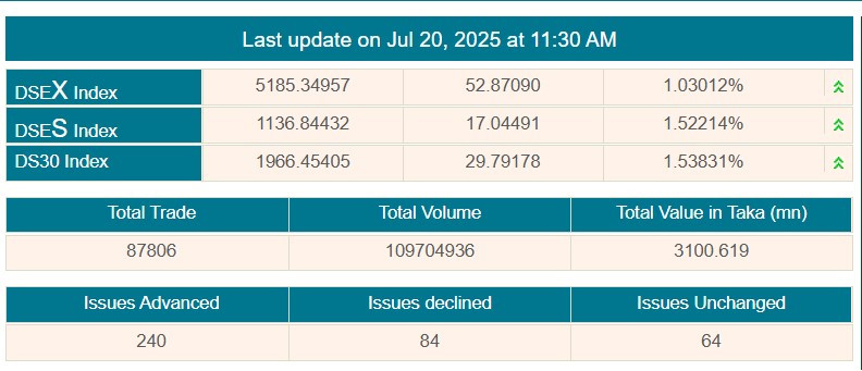 দেশের প্রধান পুঁজিবাজার ঢাকা স্টক এক্সচেঞ্জে (ডিএসই) সপ্তাহের প্রথম কার্যদিবস রোববার (২০ জুলাই) মূল্যসূচকের উত্থানের মধ্য দিয়ে চলছে লেনদেন। বেড়েছে বেশির ভাগ কোম্পানির শেয়ারদর।