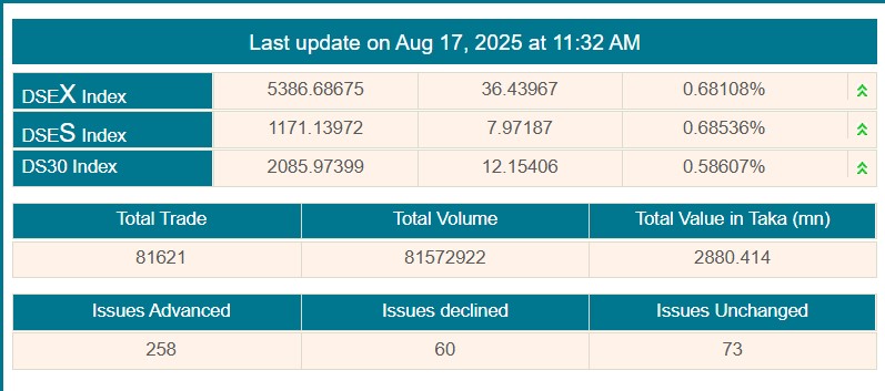 দেশের প্রধান পুঁজিবাজার ঢাকা স্টক এক্সচেঞ্জে (ডিএসই) সপ্তাহের প্রথম কার্যদিবস রোববার (১৭ আগস্ট) মূল্যসূচকের উত্থানের মধ্য দিয়ে চলছে লেনদেন। বেড়েছে বেশির ভাগ কোম্পানির শেয়ারদর।