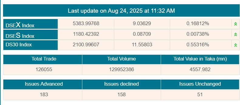 দেশের প্রধান পুঁজিবাজার ঢাকা স্টক এক্সচেঞ্জে (ডিএসই) সপ্তাহের প্রথম কার্যদিবস রোববার (২৪ আগস্ট) মূল্যসূচকের উত্থানের মধ্য দিয়ে চলছে লেনদেন। বেড়েছে বেশির ভাগ কোম্পানির শেয়ারদর।