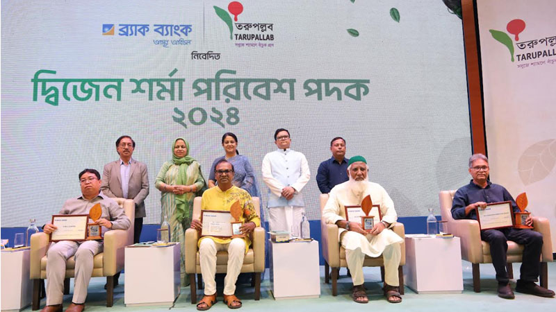 পরিবেশ সংরক্ষণ, পরিবেশ শিক্ষা এবং পরিবেশ রক্ষায় সচেতনতা বৃদ্ধিতে অবদান রাখায় চারজন ব্যক্তি ও প্রতিষ্ঠানকে ‘দ্বিজেন শর্মা পরিবেশ পদক ২০২৪’ প্রদান করা হয়েছে। এই সম্মাননা অনুষ্ঠানটি আয়োজিত হয়েছে ব্র্যাক ব্যাংকের উদ্যোগে, সহযোগিতায় পরিবেশবাদী সংগঠন ‘তরুপল্লব’।