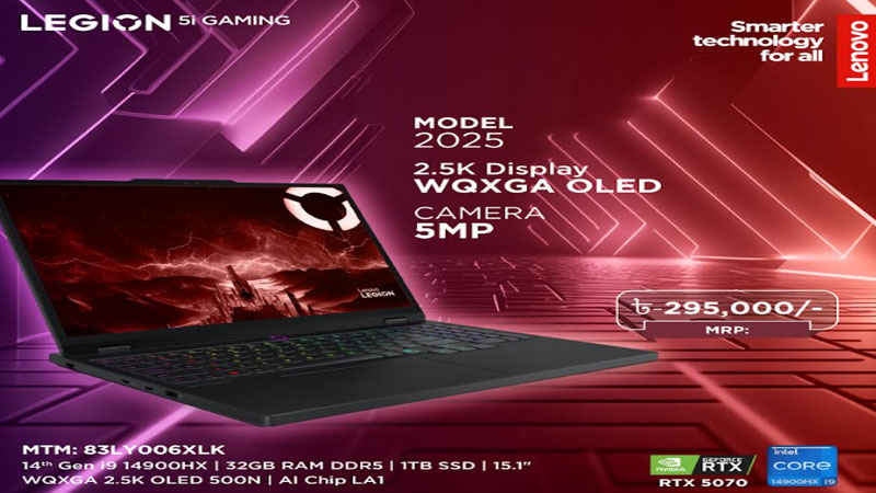 প্রতিটি গেমারের স্বপ্ন—একটি ল্যাপটপ যা শক্তিশালী, দ্রুত, আর স্মার্ট। প্রতিটি ক্রিয়েটরের চাওয়া—একটি মেশিন যা সৃজনশীলতাকে সীমাহীন করে তোলে। এই স্বপ্নকেই বাস্তবে রূপ দিতে এসেছে লেনোভো লিজিয়ন ফাইভ আই (83LY006XLK)। গ্লোবাল ব্র্যান্ড পিএলসি বাজারে এনেছে এই ল্যাপটপ, যা এআই-এর বুদ্ধিমত্তা, ওএলইডি-এর রঙিন দুনিয়া আর শক্তিশালী গ্রাফিক্সকে একসাথে মিশিয়ে তৈরি করেছে ভবিষ্যতের সত্যিকারের ড্রিম মেশিন।