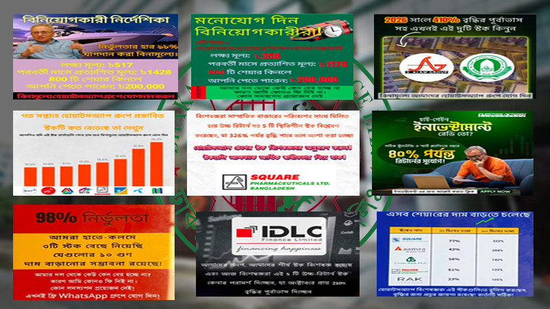 বর্তমানে প্রতারক চক্র সামাজিক যোগাযোগ মাধ্যমে এবং হোয়াটসঅ্যাপ গ্রুপে বিভিন্ন কোম্পানির আকর্ষণীয় দর বৃদ্ধির লোভ দেখিয়ে বিনিয়োগকারীদের বিভ্রান্ত করছে৷ যা সম্পূর্ণ ভিত্তিহীন এবং দণ্ডনীয় অপরাধ। এই ধরনের প্রতারক চক্রের লোভনীয় অফার থেকে সতর্ক থাকুন। অসাধু চক্রের পাল্লায় পরে আপনার কষ্টার্জিত অর্থ বিনিয়োগ করে প্রতারিত হবেন না৷ তাই সবসময় প্রতারণা থেকে সতর্ক থাকুন এবং জেনে ও বুঝে বিনিয়োগ করুন।