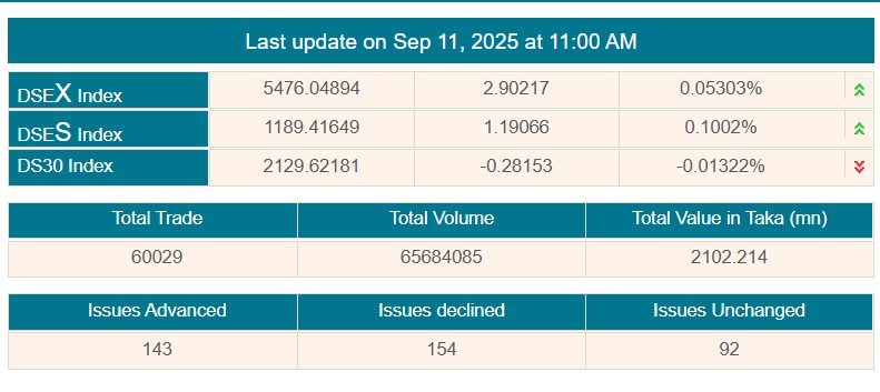 সূত্র মতে, আজ লেনদেন শুরুর প্রথম ঘণ্টায় অর্থাৎ বেলা ১১ টা পর্যন্ত ডিএসইর প্রধান সূচক বা ‘ডিএসইএক্স’ ০২ দশমিক ৯০ পয়েন্ট বেড়ে অবস্থান করছে ৫ হাজার ৪৭৬ পয়েন্টে