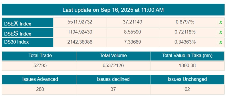 সূত্র মতে, আজ লেনদেন শুরুর প্রথম ঘণ্টায় অর্থাৎ বেলা ১১ টা পর্যন্ত ডিএসইর প্রধান সূচক বা ‘ডিএসইএক্স’ ৩৭ দশমিক ২১ পয়েন্ট বেড়ে অবস্থান করছে ৫ হাজার ৫১১ পয়েন্টে