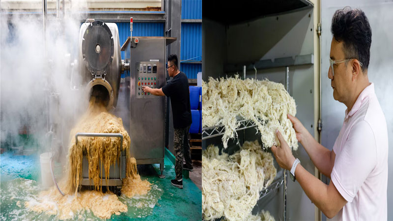 ইয়াংয়ের কোম্পানি কলা গাছের মাঝের অংশ — যা সাধারণত কলা কাটার পর মাঠেই ফেলে দেওয়া হয় — তা সংগ্রহ করে চেপে ও শুকিয়ে আঁশ তৈরি করছে। এসব আঁশ থেকে কাপড় তৈরি সম্ভব।