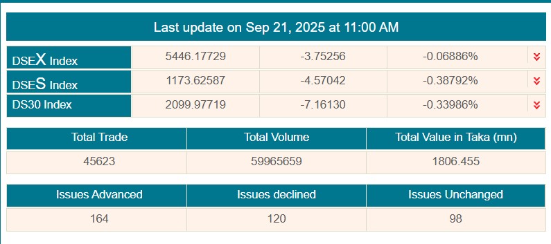 দেশের প্রধান পুঁজিবাজার ঢাকা স্টক এক্সচেঞ্জে (ডিএসই) সপ্তাহের প্রথম কার্যদিবস রোববার (২১ সেপ্টেম্বর) মূল্যসূচকের পতনের মধ্য দিয়ে চলছে লেনদেন। তবে বেড়েছে বেশির ভাগ কোম্পানির শেয়ারদর।