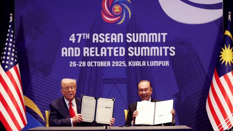 ৪৭তম আসিয়ান সম্মেলনের প্রান্তে ইতিহাস গড়লো মালয়েশিয়া ও যুক্তরাষ্ট্র। কুয়ালালামপুর কনভেনশন সেন্টারের মর্যাদাপূর্ণ অঙ্গনে আজ মালয়েশিয়ার প্রধানমন্ত্রী আনোয়ার ইব্রাহিম ও মার্কিন প্রেসিডেন্ট ডোনাল্ড ট্রাম্প স্বাক্ষর করেছেন এক নতুন বাণিজ্য ও বিনিয়োগ সহযোগিতা চুক্তিতে।