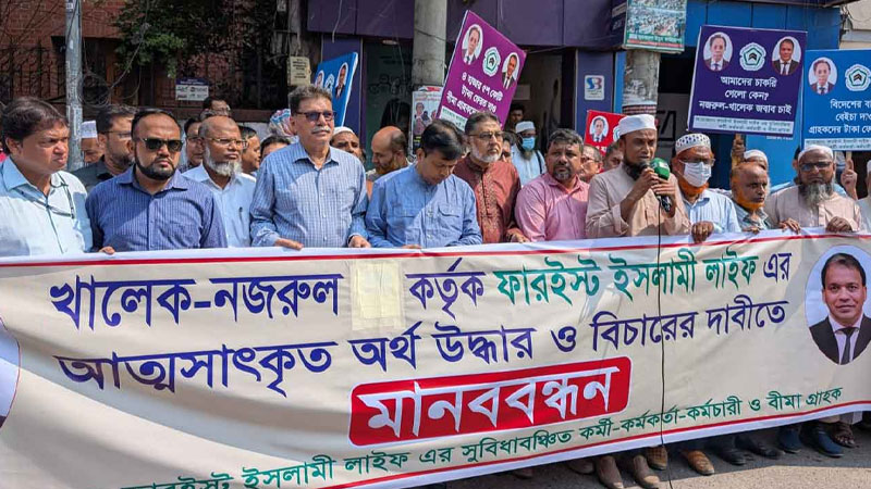আত্মসাৎ করা ৪৫০০ কোটি টাকা উদ্ধার ও পুঁজিবাজারে তালিকাভুক্ত কোম্পানি ফারইস্ট ইসলামী লাইফ ইন্স্যুরেন্সের সাবেক চেয়ারম্যান নজরুল ইসলামসহ দায়ীদের দৃষ্টান্তমূলক শাস্তির দাবিতে মানববন্ধন করেছে প্রতিষ্ঠানের কর্মকর্তা, কর্মচারী ও গ্রাহকরা।