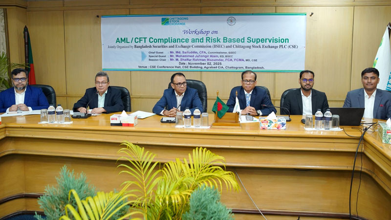 রবিবার (২ নভেম্বর) বাংলাদেশ সিকিউরিটিজ এন্ড এক্সচেঞ্জ কমিশন (বিএসইসি) ও চিটাগং স্টক এক্সচেঞ্জ পিএলসি’র (সিএসই) উদ্যোগে সিএসইর চট্টগ্রামস্থ প্রধান কার্যালয়ে “এএমএল/সিএফটি কমপ্লায়েন্স এন্ড রিস্ক বেসড সুপেরভিশন” বিষয়ক একদিন ব্যাপী প্রশিক্ষণ কর্মশালার আয়োজন করা হয়। প্রশিক্ষণ কর্মশালা তিনি এসব কথা বলেন।
