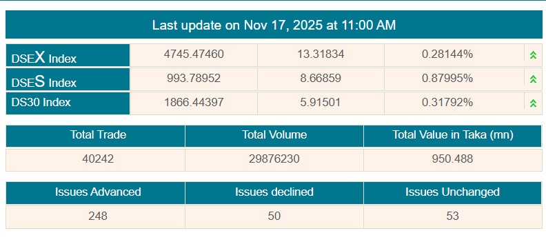 সূত্র মতে, আজ লেনদেন শুরুর প্রথম ঘণ্টায় অর্থাৎ বেলা ১১ টা পর্যন্ত ডিএসইর প্রধান সূচক বা ‘ডিএসইএক্স’ ১৩ দশমিক ৩১ পয়েন্ট বেড়ে অবস্থান করছে ৪ হাজার ৭৪৫ পয়েন্টে