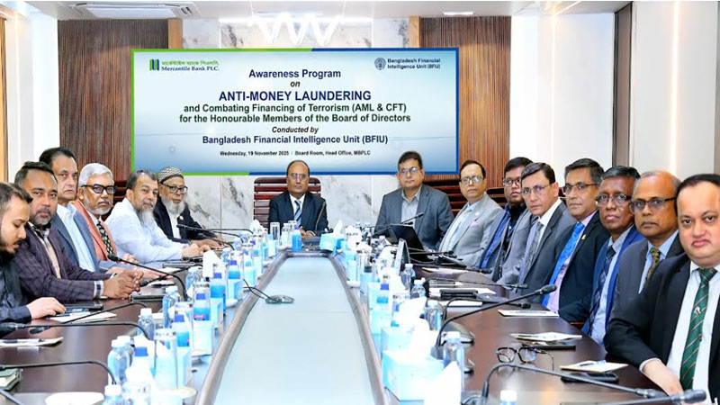 মার্কেন্টাইল ব্যাংকের অ্যান্টি মানি লন্ডারিং সচেতনতা প্রোগ্রাম গতকাল বুধবার (১৯ নভেম্বর ২০২৫) ব্যাংকের প্রধান কার্যালয়ের সভাকক্ষে অনুষ্ঠিত হয়। অনুষ্ঠানে প্রধান অতিথি হিসেবে উপস্থিত ছিলেন পরিচালক জনাব এ. কে. এম. গোলাম মাহমুদ, বিএফআইইউ এবং সম্মানিত অতিথি হিসেবে উপস্থিত ছিলেন মার্কেন্টাইল ব্যাংকের পরিচালনা পর্ষদের চেয়ারম্যান জনাব মোঃ আনোয়ারুল হক।
