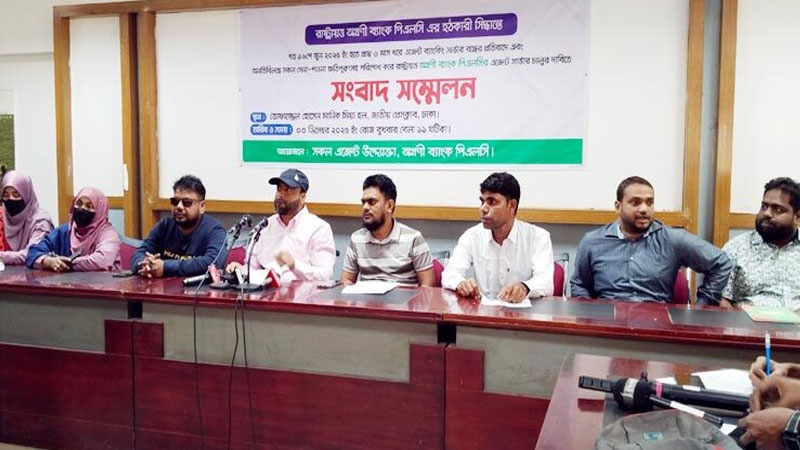 হঠাৎ করে অগ্রণী ব্যাংকের এজেন্ট ব্যাংকিং সেবা বন্ধ করে দেওয়ায় সারাদেশে চরম ভোগান্তির সৃষ্টি হয়েছে বলে অভিযোগ করেছেন এজেন্ট মালিকরা। ক্ষতিপূরণসহ দ্রুত সেবা চালুর দাবি জানিয়ে এজেন্ট ঐক্য পরিষদ বুধবার (৩ ডিসেম্বর) জাতীয় প্রেস ক্লাবের তোফাজ্জল হোসেন মানিক মিয়া হলে সংবাদ সম্মেলনের আয়োজন করে।