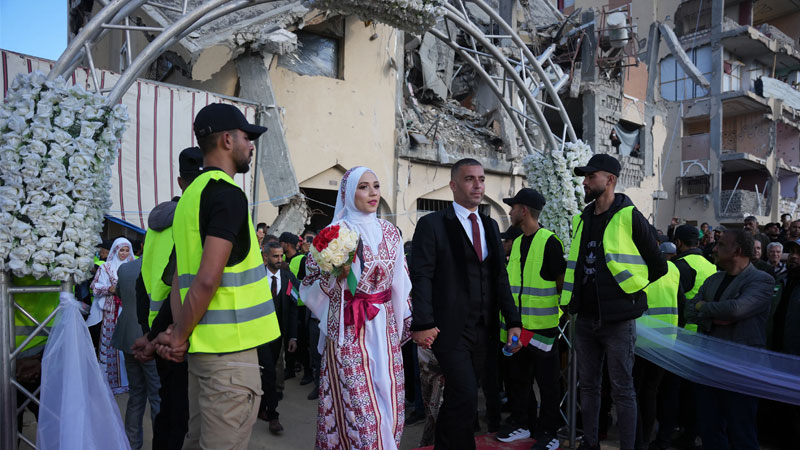 একে অপরের হাতে হাত রেখে হাঁটছেন দম্পতিরা। কনেরা পরেছেন লাল ফিতায় সজ্জিত ঐতিহ্যবাহী ফিলিস্তিনি সাদা ও লাল পোশাক। বরদের পরনে কালো স্যুট এবং টাই। পাশাপাশি হাঁটলেও তাদের এই বিয়ের পটভূমি বলছিল অন্য গল্প—জীর্ণ ভবন, কংক্রিটের স্তূপ আর ধ্বংসাবশেষ; যা গাজা উপত্যকার দুই বছরের সংঘাতের ক্ষতচিহ্ন।