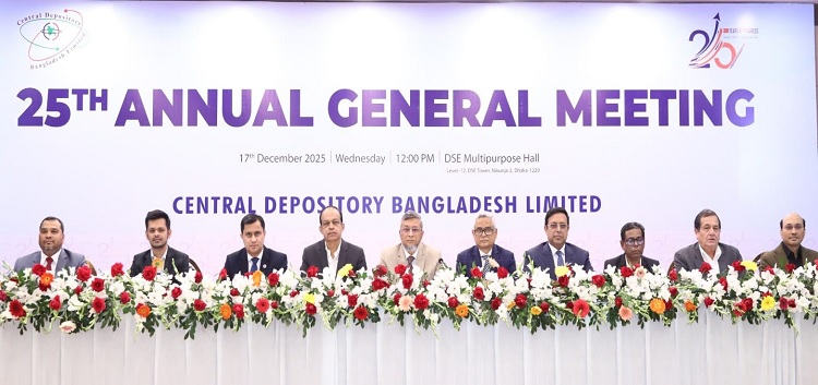 সেন্ট্রাল ডিপোজিটরি বাংলাদেশ লিমিটেড (সিডিবিএল) এর ২৫তম বার্ষিক সাধারণ সভা আজ বুধবার (১৭ ডিসেম্বর) ঢকা স্টক এক্সচেঞ্জের মাল্টিপারপাস হল (ডিএসই টাওয়ার, লেভেল -১২, প্লট ৩৬, রোড-২১, নিকুঞ্জ-২ ঢাকা -১২২৯) এ অনুষ্ঠিত হয়। সভায় সভাপতিত্ব করেন সিডিবিএল-এর পরিচালনা পর্ষদের সদস্য এ কে এম হাবিবুর রহমান। সভায় উল্ল্যেখযোগ্য সংখ্যক শেয়ারহোল্ডারের উপস্থিতিতে ২২ শতাংশ নগদ লভ্যাংশ অনুমোদন করা হয়।