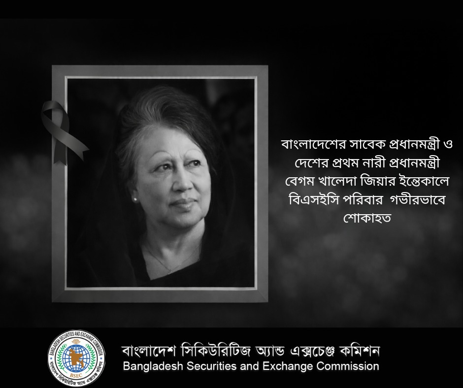 সাবেক প্রধানমন্ত্রী ও বিএনপি চেয়ারপার্সন বেগম খালেদা জিয়ার মৃত্যুতে পুঁজিবাজার নিয়ন্ত্রক সংস্থা বাংলাদেশ সিকিউরিটিজ অ্যান্ড এক্সচেঞ্জ কমিশন (বিএসইসি) গভীর শোক প্রকাশ করেছে।