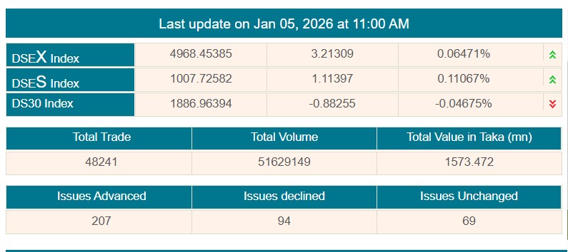 সূত্র মতে, আজ লেনদেন শুরুর প্রথম ঘণ্টায় অর্থাৎ বেলা ১১ টা পর্যন্ত ডিএসইর প্রধান সূচক বা ‘ডিএসইএক্স’ ৩ দশমিক ২১ পয়েন্ট বেড়ে অবস্থান করছে ৪ হাজার ৯৬৮ পয়েন্টে।