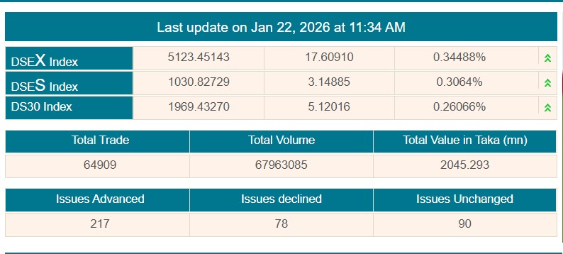 সূত্র মতে, আজ লেনদেন শুরুর প্রথম দেড় ঘণ্টায় অর্থাৎ বেলা ১১ টা ৩০ পর্যন্ত ডিএসইর প্রধান সূচক বা ‘ডিএসইএক্স’ ১৭ দশমিক ৬০ পয়েন্ট বেড়ে অবস্থান করছে ৫ হাজার ১২৩ পয়েন্টে।