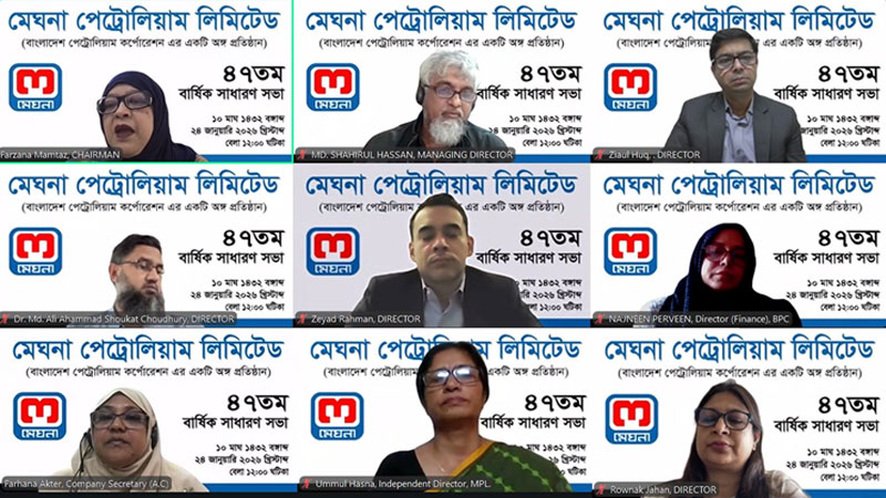 মেঘনা পেট্রোলিয়াম লিমিটেড এর ১০ম বিশেষ সাধারণ সভা এবং ৪৭ তম বার্ষিক সাধারণ সভা শনিবার ( ২৪ জানুয়ারী )যথাক্রমে সকাল ১০ টা ৩০ মিনিটে এবং দুপুর ১২ টায় ‘‘ডিজিটাল প্ল্যাটফর্মে” অনুষ্ঠিত হয়।
