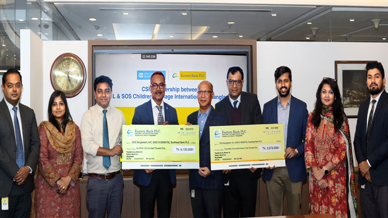 সম্প্রতি ঢাকায় ব্যাংকের প্রধান কার্যালয়ে আয়োজিত এক অনুষ্ঠানে ইস্টার্ন ব্যাংক পিএলসির হেড অব প্ল্যানিং, স্ট্র্যাটেজি অ্যান্ড গভর্ন্যান্স আশরাফ উজ জামান এসওএস চিলড্রেন’স ভিলেজেস বাংলাদেশের ন্যাশনাল ডিরেক্টর ড. মো. এনামুল হকের হাতে দুটি চেক হস্তান্তর করেন।