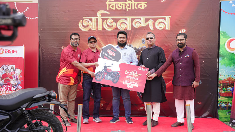 ইন্টারন্যাশনাল স্কুল ঢাকা (আইএসডি) মাঠে দুদিনব্যাপী নগদ কার্নিভালে এক আড়ম্বরপূর্ণ অনুষ্ঠানের মাধ্যমে নগদের প্রশাসক মো. মোতাছিম বিল্লাহ বিজয়ীর হাতে মেগা পুরস্কারটি তুলে দেন। এ সময় নগদের অতিরিক্ত ব্যবস্থাপনা পরিচালক শ্যামল বি দাস, নগদের চিফ মার্কেটিং অফিসার সাইমন ইমরান হায়দার ও চিফ কমার্শিয়াল অফিসার মোহাম্মদ শাহীন সারওয়ার ভূইয়া উপস্থিত ছিলেন।