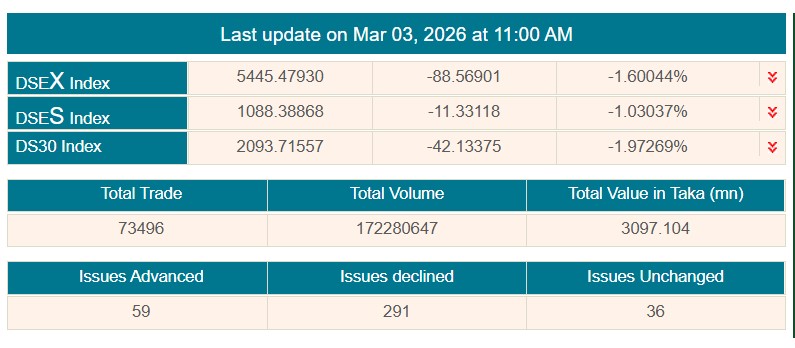 সূত্র মতে, আজ লেনদেন শুরুর প্রথম ঘণ্টায় অর্থাৎ বেলা ১১ টা পর্যন্ত ডিএসইর প্রধান সূচক বা ‘ডিএসইএক্স’ ৮৮ দশমিক ৫৬ পয়েন্ট কমে অবস্থান করছে ৫ হাজার ৪৪৫ পয়েন্টে।