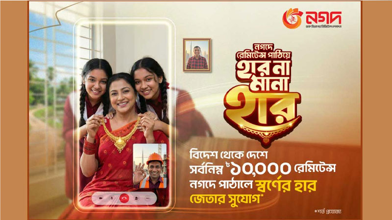 নগদ রেমিট্যান্সে জিতে নিন ‘হার না মানা হার’ শিরোনামে এই ক্যাম্পেইন চলতি মাসের ১৮ তারিখ থেকে শুরু হয়েছে। প্রবাসীরা নগদের মাধ্যমে দেশে সর্বনিম্ন ১০,০০০ টাকা রেমিট্যান্স পাঠালেই পাচ্ছেন স্বর্ণের হার জেতার সুযোগ। এছাড়া সরকারি প্রণোদনা ২ দশমিক ৫ শতাংশ উপভোগ করার সুযোগও রয়েছে।