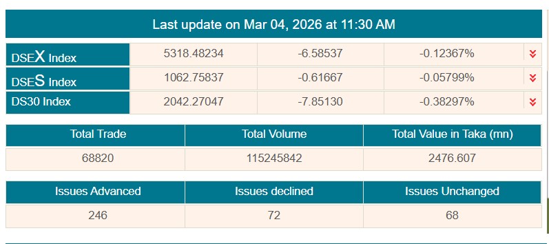 সূত্র মতে, আজ লেনদেন শুরুর প্রথম দেড় ঘণ্টায় অর্থাৎ বেলা ১১ টা ৩০ পর্যন্ত ডিএসইর প্রধান সূচক বা ‘ডিএসইএক্স’ ৬ দশমিক ৫৮ পয়েন্ট কমে অবস্থান করছে ৫ হাজার ৩১৮ পয়েন্টে।