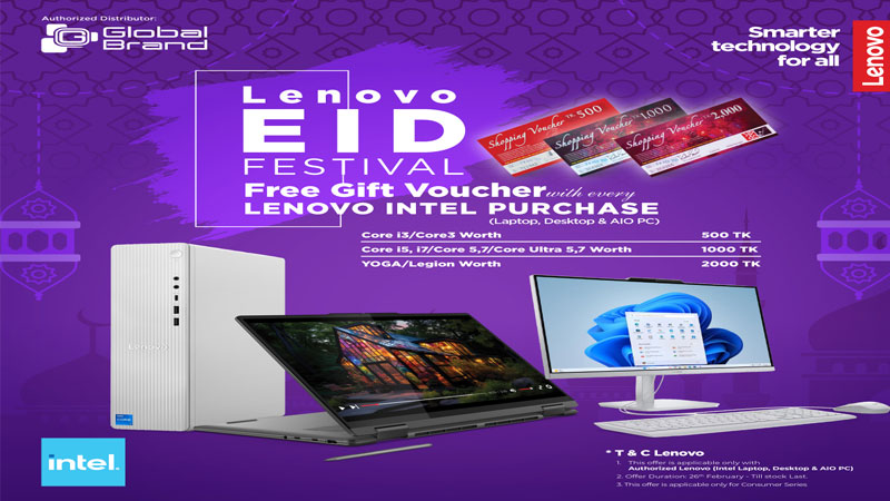 ঈদকে সামনে রেখে নতুন ডিভাইস কেনার পরিকল্পনা করছেন? দেশের অনুমোদিত তথ্যপ্রযুক্তি ডিস্ট্রিবিউটর গ্লোবাল ব্র্যান্ড পিএলসি ঈদ উপলক্ষে বিশেষ “লেনোভো ঈদ ফেস্টিভাল” অফার চালু করেছে। নির্দিষ্ট লেনোভো ইন্টেল ল্যাপটপ, ডেস্কটপ ও এআইও পিসি ক্রয়ে ক্রেতারা আকর্ষণীয় শপিং গিফট ভাউচার পাচ্ছেন।