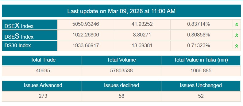 সূত্র মতে, আজ লেনদেন শুরুর প্রথম ঘণ্টায় অর্থাৎ বেলা ১১ টা পর্যন্ত ডিএসইর প্রধান সূচক বা ‘ডিএসইএক্স’ ৪১ দশমিক ৯৩ পয়েন্ট বেড়ে অবস্থান করছে ৫ হাজার ৫০ পয়েন্টে।