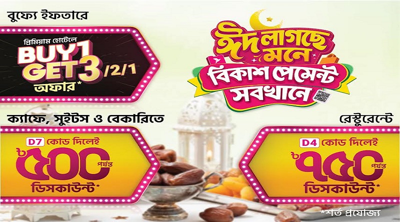 আগামী ২০ মার্চ, ২০২৬ পর্যন্ত দেশের বেশকিছু প্রিমিয়াম হোটেলে বিভিন্ন ইফতার প্যাকেজে বিকাশ পেমেন্টে রয়েছে ‘বাই ওয়ান গেট থ্রি/টু/ওয়ান’ অফার।