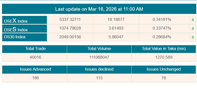সূত্র মতে, এদিন ডিএসইর লেনদেন শুরুর প্রথম ঘণ্টা অর্থাৎ বেলা ১১টা পর্যন্ত ডিএসইর প্রধান সূচক বা ‘১৮ দশমিক ১৮ পয়েন্ট বেড়ে অবস্থান করছে ৫ হাজার ৩৩৭ পয়েন্টে।