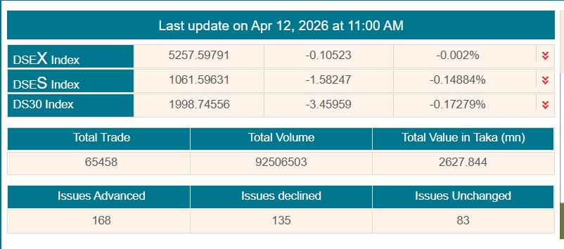 সূত্র মতে, এদিন ডিএসইর লেনদেন শুরুর প্রথম ঘণ্টা অর্থাৎ বেলা ১১ টা পর্যন্ত ডিএসইর প্রধান সূচক বা ‘ডিএসইএক্স’ ০ দশমিক ১০ পয়েন্ট কমে অবস্থান করছে ৫ হাজার ২৫৭ পয়েন্টে।