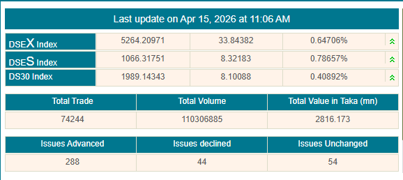 সূত্র মতে, এদিন ডিএসইর লেনদেন শুরুর প্রথম ঘণ্টা অর্থাৎ বেলা ১১ টা পর্যন্ত ডিএসইর প্রধান সূচক বা ‘ডিএসইএক্স’ ৩৩ দশমিক ৮৪ পয়েন্ট বেড়ে অবস্থান করছে ৫ হাজার ২৬৪ পয়েন্টে।
