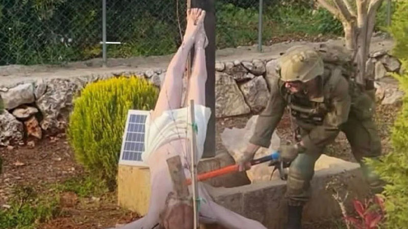 ওই ছবিতে দেখা যাচ্ছে, একজন ইসরায়েলি সেনা বড় আকারের একটি ভারী হাতুড়ি দিয়ে ক্রুশবিদ্ধ যিশুর মূর্তির মাথায় আঘাত করছে। মূর্তিটি ক্রুশ থেকে খুলে পড়ে গেছে।