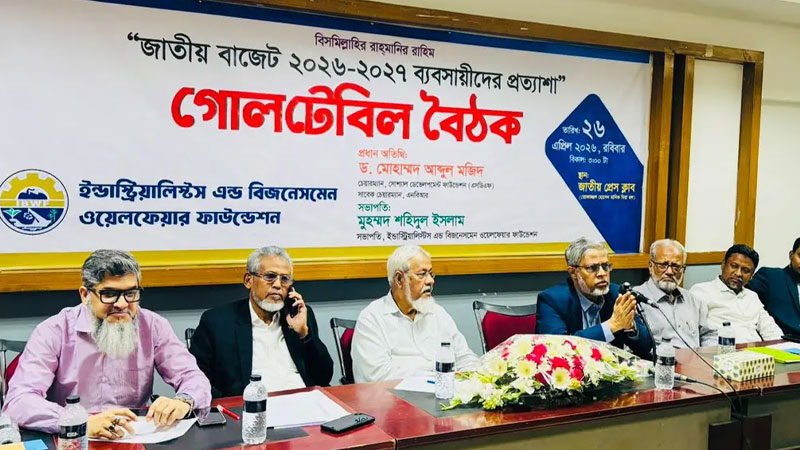 রোববার (২৬ এপ্রিল) জাতীয় প্রেসক্লাবে ‘জাতীয় বাজেট ২০২৬-২০২৭ : ব্যবসায়ীদের প্রত্যাশা’ শীর্ষক এক গোলটেবিল বৈঠকে তারা এসব কথা বলেন। ইন্ডাস্ট্রিয়ালিস্টস অ্যান্ড বিজনেসমেন ওয়েলফেয়ার ফাউন্ডেশন-এর উদ্যোগে এ গোলটেবিল বৈঠক অনুষ্ঠিত হয়।